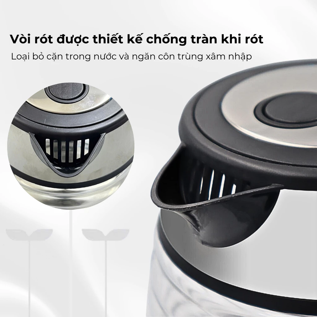 Ấm có thiết kế sang trọng với vỏ ngoài bằng thủy tinh chịu nhiệt, mang đến vẻ đẹp tinh tế và hiện đại. Đặc biệt, với chất liệu thủy tinh trong suốt, bạn có thể dễ dàng quan sát quá trình đun nước bên trong, tạo thêm sự thú vị khi sử dụng.