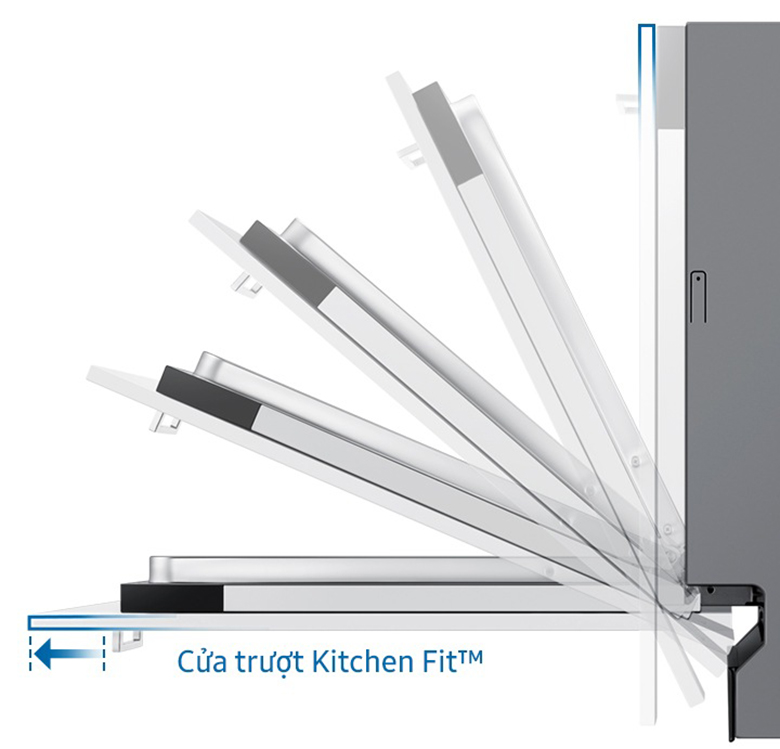 Cửa máy rửa bát Samsung DW60CG550FSGSV được thiết kế dạng trượt Kitchen Fit™ với bản lề trượt cho phép nắp cửa trượt lên trên khi mở, nhờ đó phần cửa có thể mở hoàn toàn mà không bị cắt phần chân bên dưới, thuận tiện cho việc lấy hoặc cho vào các vật dụng vào bên trong khay rửa.