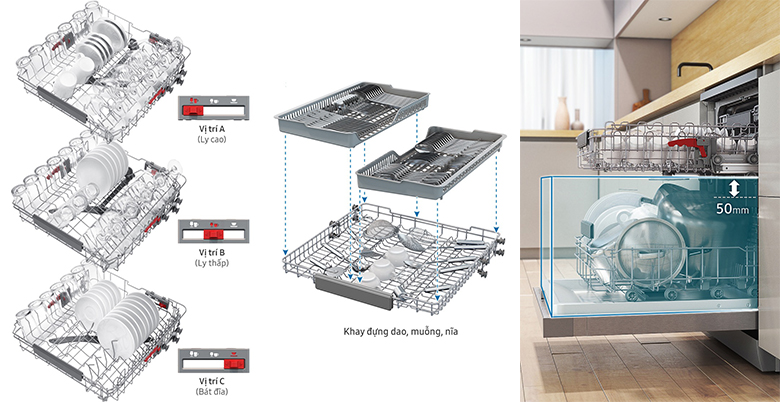 Việc sắp xếp tất cả các loại chén bát khác nhau của bạn có thể là một thách thức. Máy rửa bát Samsung DW60CG550FSGSV được trang bị 3 khay rửa gồm: khay dao kéo, khay trên và khay dưới. Phần giá đỡ bên trái của ray số 2 có thể gập linh hoạt, và điều chỉnh theo 3 cài đặt bằng cần gạt phía trong. Độ cao giữa 2 tầng trên và dưới cũng có thể điều chỉnh, bằng cách di chuyển ray chén đĩa lên hoặc xuống. Khay dành riêng cho dao kéo và đồ dùng nhà bếp sẽ giúp giải phóng thêm không gian ở các giá đỡ bên dưới. Hơn thế nữa, khay này có thể tháo rời và di chuyển. Nhờ đó, người dùng dễ dàng sắp xếp chén dĩa với hình dạng và kích thước khác nhau.