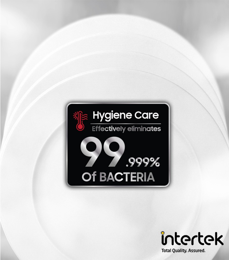 Chế độ Diệt khuẩn Hygiene Care kéo dài thời gian xả cuối cùng và tăng nhiệt độ lên 70℃, tráng lại toàn bộ bát đĩa và dụng cụ được rửa; nhờ đó giúp loại bỏ 99.999% vi khuẩn gây hại, đảm bảo các vật dụng được vệ sinh tối đa và an toàn khi sử dụng.
