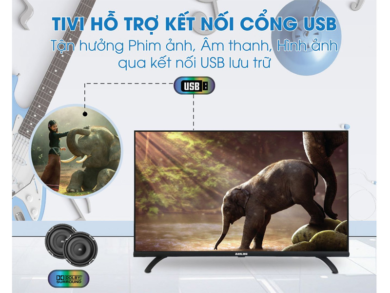 Tivi 32 inch Darling 32HD964S ngoài kết nối wifi ra thì còn có các cổng kết nối: HDMI, USB, cổng AV, cổng âm thanh kỹ thuật số, cổng Anten để kết nối với các thiết bị ngoại vi khác.