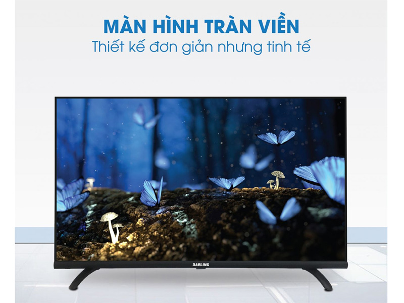 Tivi Darling thiết kế tràn viền với cạnh mặt trên và 2 bên rất mỏng để tối ưu hơn không gian hiển thị hình ảnh, cạnh dưới của tivi được làm dày hơn để bố trí logo của Darling.